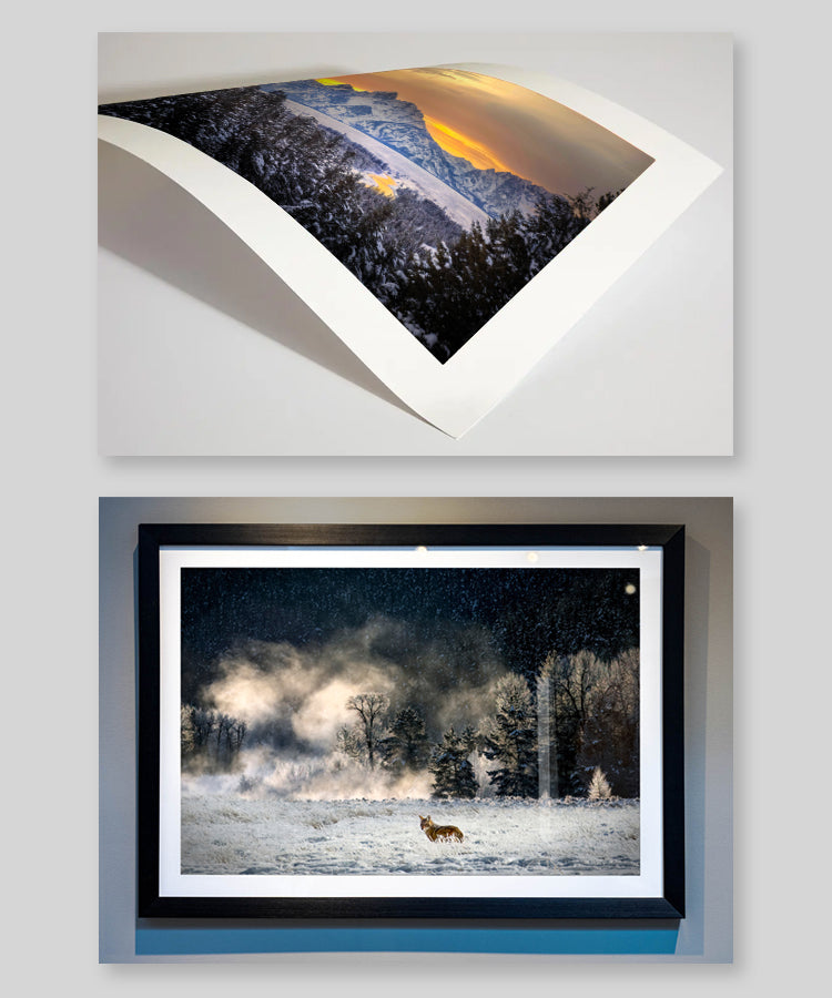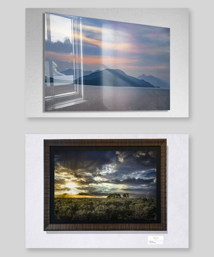 The bottom image shows an HD Acrylic print with one of our decorative moulding options.