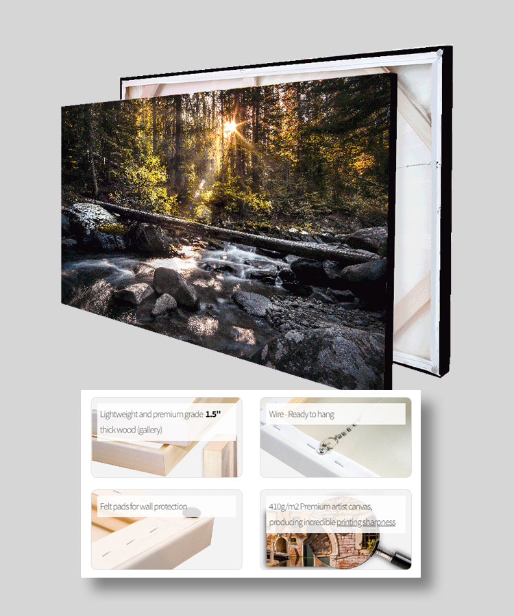 Our canvas is designed to meet art galleries' and museum's longevity requirements and ensure consistency of shades for up to 200 years old. The printing process is Giclee with Pigment Ink on a Premium Fine Art Matte Canvas 410g/m2. Each canvas is finished with a Matte varnish which provides a 'Fine Art' look and provides a great color gammut. Canvas is a classic look.