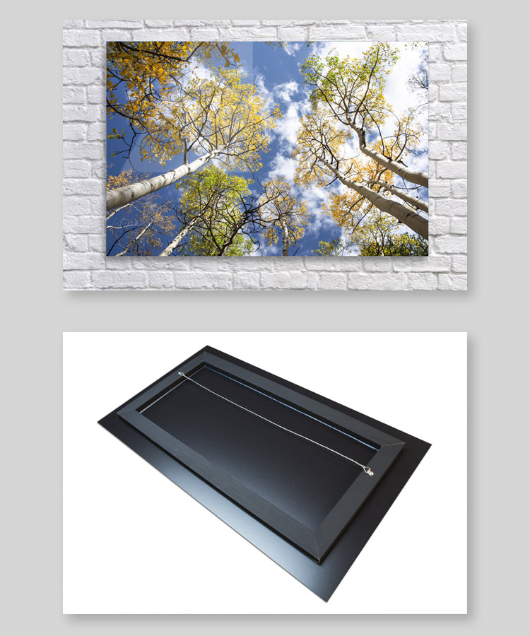 These can be ordered with a museum float mount (hovers off the wall...see image to the right), or you can upgrade to a frame or decorative moulding option (similar to the framed Acrylic image below).
